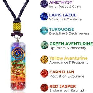BASK IN POSITIVITY and promote spiritual well-being with our 7-Chakra Orgone Pendant. 7 CHAKRA STONES include amethyst, lapis lazuli, blue aventurine, green aventurine, citrine, red carnelian and red jasper.