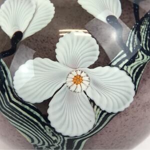 Vintage Orient & Flume glass art paperweight with white flowers attached to branches, rounded petal flowers with ribbed/textured detail, Dogwood flower?, mauve-like ground, signed 1981 Orient & Flume with "Bruce Sillars" name on base, collectible paperweight/home decor/garden/serene/farmhouse/cottagecore