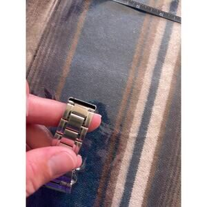 Classic silver colored luxury wristwatch by Orient. Day and Date feature with the box above the day going from red (am) to blue (pm). Gorgeous square shape with a warm cream background