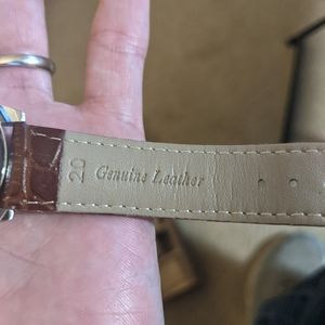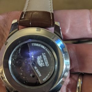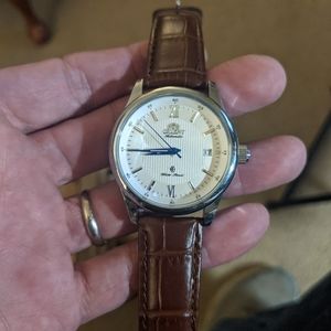Nice orient branded watch. Automatic movement with a beautiful face and movement. Unusual blue hands and killer leather strap makes this a real conversation piece!