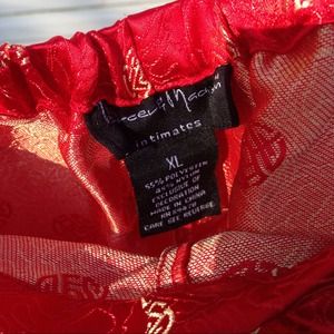 Vibrant Red pajama set: pants, slippers, & bag. Purchased in Hong Kong for my sister who never used or wore it. New with tags. Has gold trim on bottom & gold drawstrings. Great gift, set comes all in a matching bag!! FYI -tag says XL but fits more like a large.