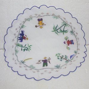 One large 12 inch plate setting mat and 4 stemware dollies measuring 4.25 inches. These items look to be hand stitched and ready to decorate your next tea party. There is one small area of damage on the larger item as can be seen in the images. There is a small pin hole at one of the edges. The hole is smooth and does not appear to be spreading. No sure of the type of cloth but it feels like a linen.