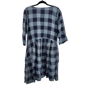 Orientique Naturally Peasant Dress S Blue Buffalo Check Linen Oversized Pockets