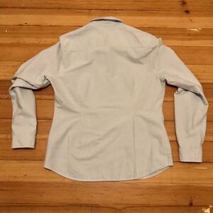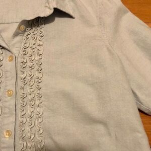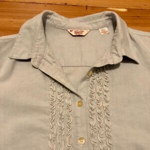 Orig. Penguin Oxford ruffle front button down. Size (L). Excellent used condition. Light blue Oxford cotton.