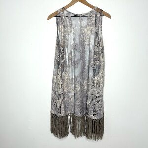 Origami Floral Fringe Sleeveless Boho Topper Vest - Gray