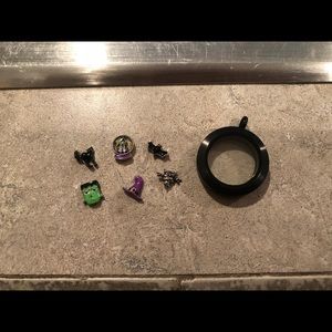 Hinged Locket with strong magnetic closure. The glass window of the Locket is about the size of a nickel and holds 3-5 Charms. Charms include black cat, Frankenstein’s monster, witch’s hat, black bat, haunted house snow globe, and Olive Owl mummy. The fairy dust will really set off your look! New condition in box.