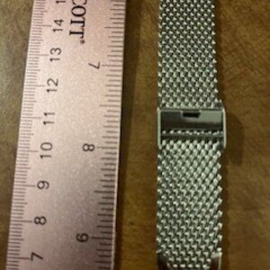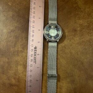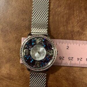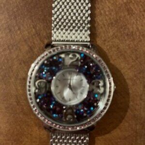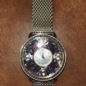 This is an Origami Owl watch in like new condition (I used to be an O2 seller). This is a watch that has a "woven" silver band that is adjustable in length and can go as long as 9.25 inches. It has a ton of purple and teal sparkles spread around the large face numbers. These can be removed and changed out by twisting off the top face plate. Needs a battery.