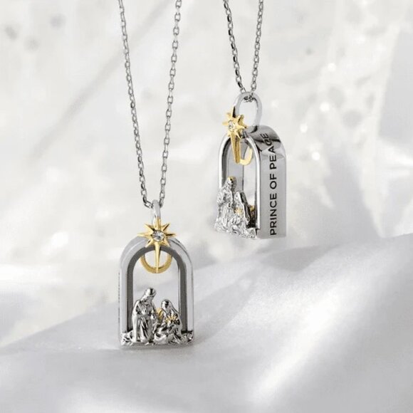 O come let us adore him. Keep the reason for the season close to your heart with our Nativity Capsule Locket Necklace. Delicately designed, this 20-22″ capsule locket necklace adorned with the nativity scene on the inside is a symbol of faith and hope. Inscribed with “Isaiah 9:6” and “Prince of Peace”, this locket necklace also features a dazzling crystal Star of Bethlehem, adding an extra touch of significance.