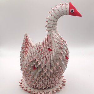 This basket was made using the modular origami technique, which involves folding multiple pieces of paper into individual units that are then assembled together to create a larger structure. The intricate design of the swan is achieved through the careful folding and positioning of these units, which are glued in place to add stability.
