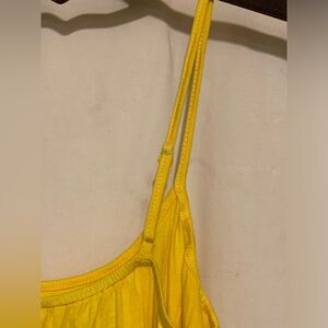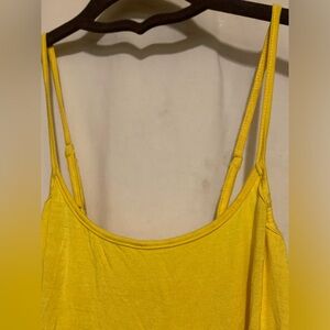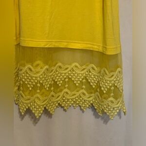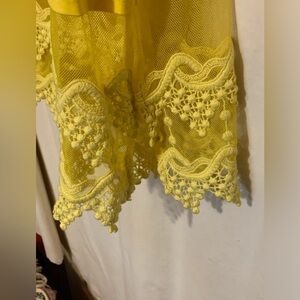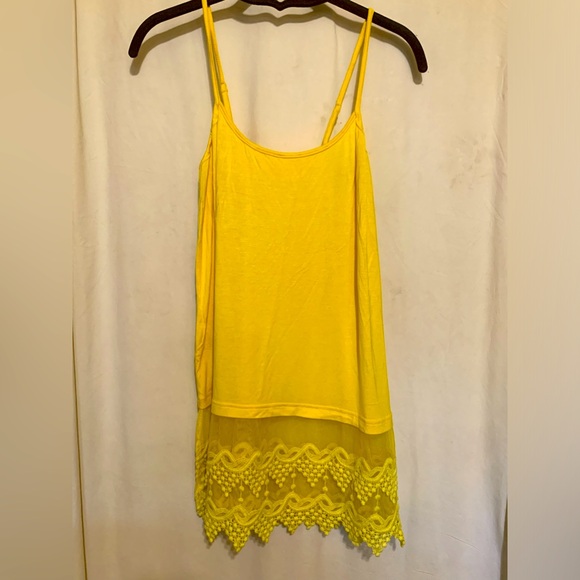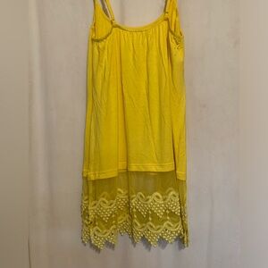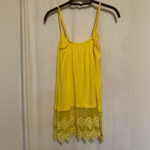 Tank by Origami. Adjustable spaghetti straps, lace and crochet detail around entire bottom with slit on each side. Soft and very stretchy. Sample piece no tags inside. NWOT. Color is Yellow. Size is Small.