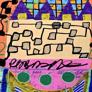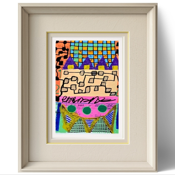 Add a pop of color to your space with this vibrant abstract art print. This piece brings together shades of orange, pink, and blue for a striking look. It's a page from a 2022 calendar planner, shows pen marking behind the art. The page is adhered to acrylic paper.