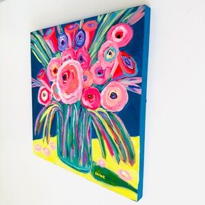 Collectible🖼️. Bright, Cheery, Whimsical Floral Bouquet💐 in a water vase. This one-of-a-kind original work of art is hand painted with high-quality acrylic paint on a wood panel. For protection, it has been varnished with a glossy seal.