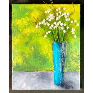 Mixed media wall art in pretty teal, greens, gray. Hand painted acrylic backdrop on a glossy finished textured canvas. Includes faux flowers of small white blossoms in a tall vase.