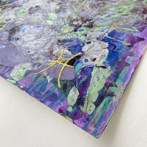 This energetic art piece with hidden vintage postage stamps collage, resin pearls, and accented with aurora borealis (AB) flakes is painted on a sturdy mixed media art paper for years of viewing enjoyment.