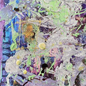 ‘Summer Pop 1987’ is an exciting purple, green and gold original one-of-a-kind handmade mixed media painting by Artist Tristina Dietz Elmes.