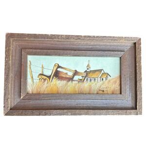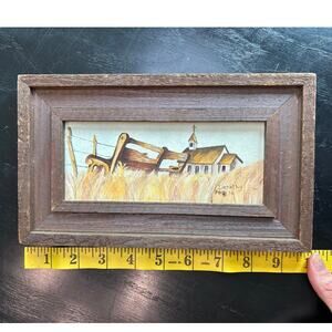 Original Artwork- Painting- Church Countryside- Brown Frame- 10x5.5 in