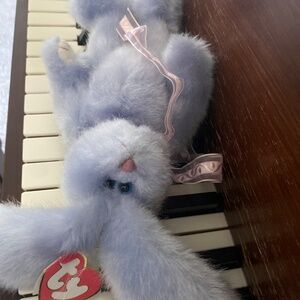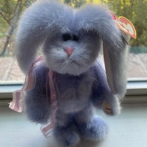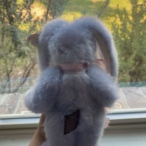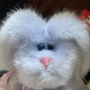 She has blue eyes, fuzzy fur, long floppy ears and a pink nose.