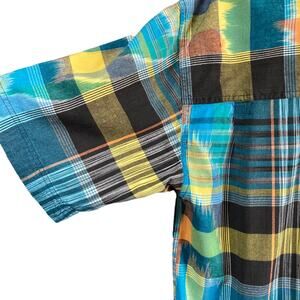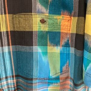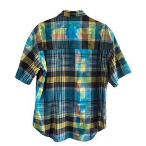 Original Blueprint Label Button Down Shirt Blue Yellow Green Plaid Men's Sz Large. Short sleeves. Fun plaid with a "paint washed" effect. 60% cotton, 40% rayon.