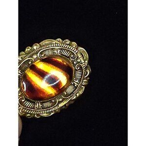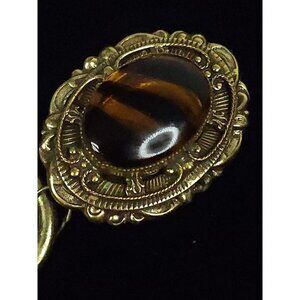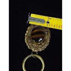 This beautiful vintage brooch by Original By Robert features a striking striped design with brown and multicolor accents. The dangle style adds movement and flair to any outfit. The brooch is made of gold-tone metal and acrylic material. It is signed by the designer and is an original piece from the United States.