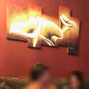 This is a 47 x 23 inch five piece original painting that my ex-husband gifted me w/ several yrs ago. I'm tired of looking it on my living room wall, as nice as the shades of orange look against the red paint. My loss is your gain. The painting is an original. He bought it while he was visiting his family in Portugal. Artists name is at the bottom of 5th piece. Not sure how much he paid for it. Make me an offer- chances are I won't turn it down. Smoke free home. Thank you for looking.
