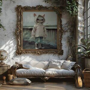 Add a unique and moody touch to your space with this anthropomorphic cat art print. Featuring a grumpy yet stylish feline dressed in a distressed hoodie and boots, this surreal portrait blends gothic aesthetics with streetwear fashion. Perfect for cat lovers, fantasy art collectors. Ideal as wall decor, a gift for pet lovers, or a trendy conversation piece, this artwork captures a mix of cute and eerie, making it a must-have for modern art enthusiasts.