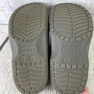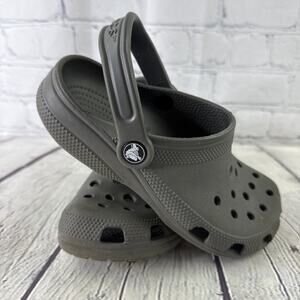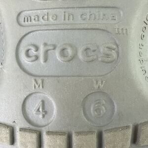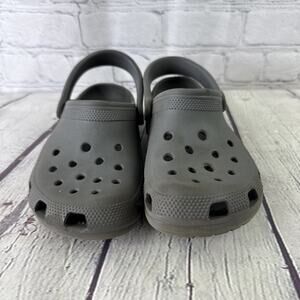 The product is a pair of original Crocs slip-on shoes in grey gray color. These unisex shoes are designed for men in size 4 and women in size 6. Made of rubber, they feature a boat shoe style with a slip-on closure for easy wear. The outsole and upper material are both rubber, providing comfort and durability for everyday casual wear. Perfect for those looking for a stylish yet practical footwear option. See photos for more details and flaws