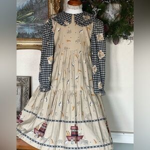 Gorgeous Original 1994 Daisy Kingdom 2- Pc Pinafore Apron Peter Pan ruffle collar Dress. Noah’s Ark