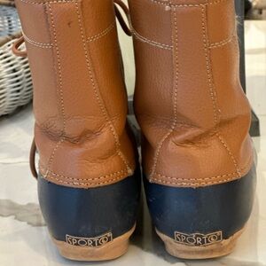 The EUC Sporto Duck Dede Winter Rain Boots in ladies size 9 are perfect for the cold and rainy seasons. These waterproof boots feature a stylish plaid lining and a lace-up closure for a secure fit. The blue color and solid pattern add a fun and stylish touch to the design, making them suitable for outdoor activities or casual wear. Made with leather upper material, these rain boots are durable and designed for comfort during winter, fall, and spring weather.