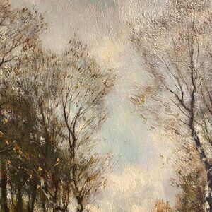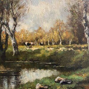This original, signed oil painting is a perfect example of his realist approach to Dutch landscapes. The painting features a tranquil Holland pastoral landscape with a meandering stream, tall trees, cows in the far distance and a pair of ducks cozied up in the foreground.
