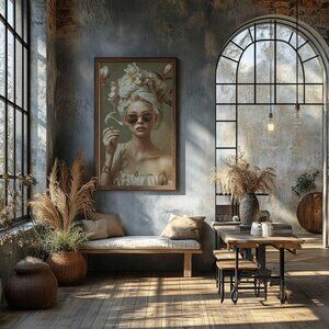 This stunning digital art print features a surreal fashion portrait of a woman adorned with floral elements in her hair, exuding both elegance and whimsy. The soft, vintage-inspired styling combined with contemporary details like the oversized sunglasses and delicate jewelry gives this piece a modern yet timeless quality. Perfect for anyone who loves unique, avant-garde art and bohemian decor, this print makes an eye-catching addition to any space.