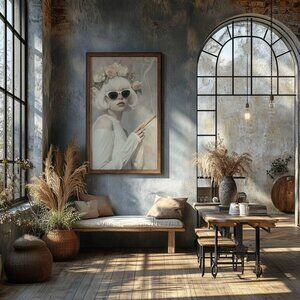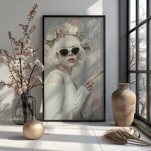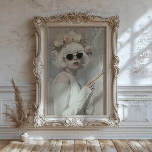 This stunning digital art print features a surreal fashion portrait of a woman adorned with floral elements in her hair, exuding both elegance and whimsy. The soft, vintage-inspired styling combined with contemporary details like the oversized sunglasses and long sleeve open sholder turtle neck gives this piece a modern yet timeless quality. Perfect for anyone who loves unique, avant-garde art and bohemian decor, this print makes an eye-catching addition to any space.