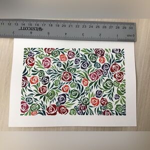 Original floral India ink drawing made by me! Hand-drawn with a nibbed pen. Measures about 7"x5". Red, orange, purple, green, and pink rose-like flowers with green leaves. This artwork is signed on the back because I couldn't decide which side was "up".