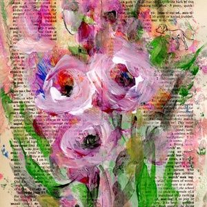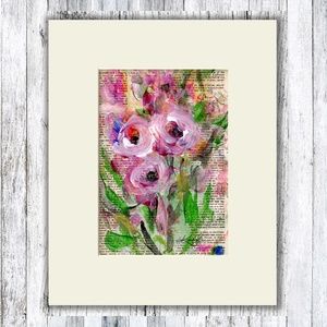 I painted these as inexpensive works perfect for gift giving. They are a series of florals painted in acrylics on a vintage dictionary page. Just charming! They would fit perfectly in a standard 8" x 10' Mat (as shown in the example) for framing.