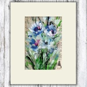 I painted these as inexpensive works perfect for gift giving. They are a series of florals painted in acrylics on a vintage dictionary page. Just charming! They would fit perfectly in a standard 8" x 10' Mat (as shown in the example) for framing.