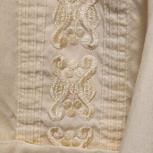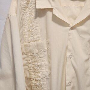 Men's size 5XL, Guayabera shirt By Dimension. Ivory, 4 pockets, and embroidered on the front. Polyester and cotton, made in China, machine washable.