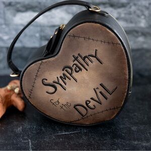 Original Hand Painted faux leather shaped black purse with voodoo doll face on one side and “Sympathy for the Devil”, inspired by Rolling Stones song, painted on the other side.