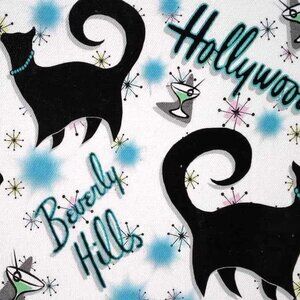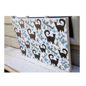 This is a Fabulous Original "Hollywood Cats" Giclee Canvas Wrap that was created as Movie Prop Art for the studios in Hollywood. The piece features a Mid-Century vibe with black silhouetted cats adorned with necklaces floating on a field of MCM cocktails and starbursts with the locations that these cats dwell in - "Hollywood" & "Beverly Hills". The sides of the piece are wrapped around with a MCM starburst pattern applied. This was created by Award Winning California Artist John A. Conroy for the props department at a major Hollywood studio, where many of Conroy's art is stored and has been featured in film and TV.