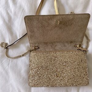 The Jimmy Choo Gold Glamour shoulder bag is a stunning accessory that exudes elegance with its shimmering gold finish and fine glitter texture. Its structured rectangular design is both chic and practical, making it a standout piece for any special occasion. The matching gold shoulder strap adds a touch of convenience, ensuring you carry it with ease and style. Never used. Like new.