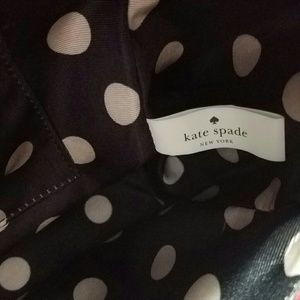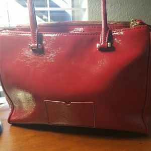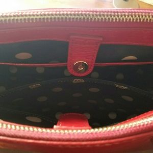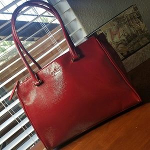 Glossy Red! Pantent Genuine Leather, Kate Spade emblem and trimmings are gold. Inside material is silk black with white polka dots. A real eye catcher. Don't miss out ladies.