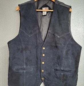 two open welt front pockets, five brass snaps, nylon back with adjustable buckle, pit to pit 23"  length 25"
