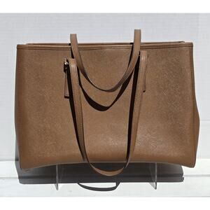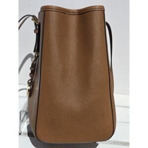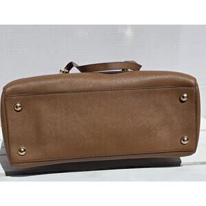 This is an original Michael Kors saddle brown handbag with goldware. It has a bag width of 14 inches, a bag height of 11 inches, and a bag depth of 6 inches. The handle drop is 10 inches and it has double handles. The lining material is fabric and the lining color is beige. The hardware color is gold. The exterior material is leather and the brand is Michael Kors. The style is a tote and it's designed for women. This is a medium-sized handbag with a Michael Kors saddle model.