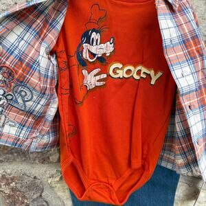 3 piece set includes long sleeve goofy tee shirt with snaps, long sleeve plaid button up with embroidered mickey and elastic waist jeans