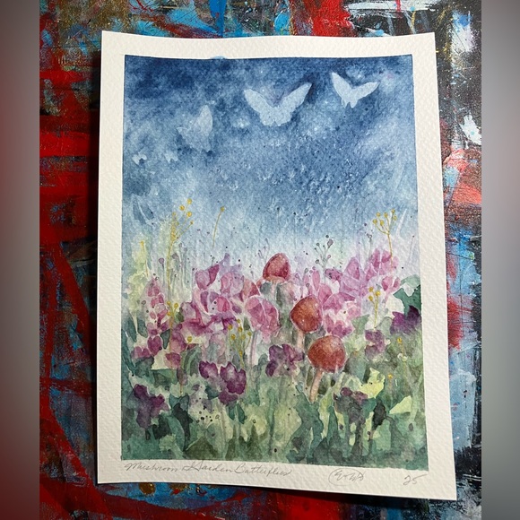 Original Mushrooms butterfly painting floral nature watercolor art Artettina USA
