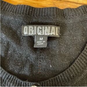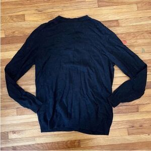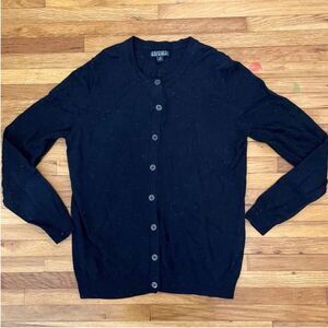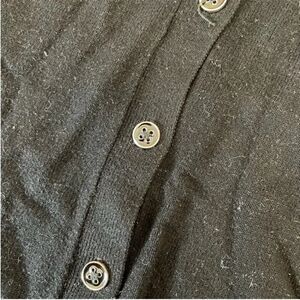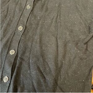 Black button down cardigan with lots of silver sparkle specks sewn in throughout the cardigan. (It’s not hair or lint). Back has a dotted line that’s see through up close shown in photos 6-7, but it’s not very see through when worn. Crew neckline and ribbed cuffs.