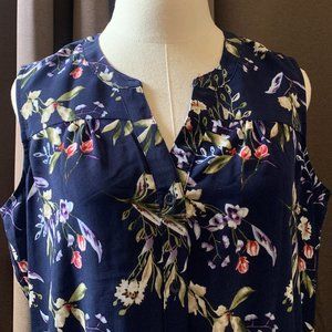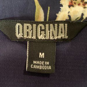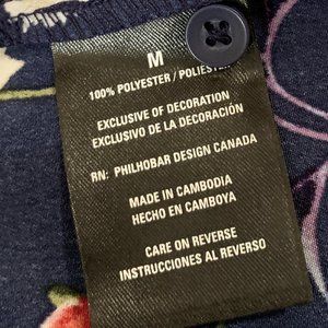 Like new (only worn once) Original Nicole Miller navy floral sleeveless dress. Very soft, comfortable material. Curved neckline, with a small V cutout. Top of the dress buttons all the way down to the waistline. Waist has elastic with a built in tie. Skirt contains hidden pockets. Width (pit to pit): 21.5 inches; Waist (at elastic band): 17.5 inches; Length (shoulder to hem): 36.5 inches.
