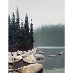 Original Oil Painting Alpine Lake Pines Mist Atmospheric Landscape 11x14" Signed