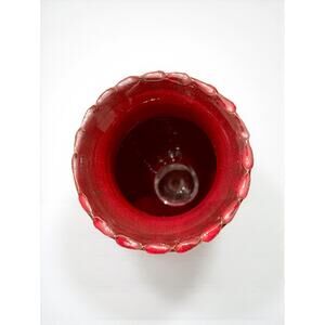 Hand-thrown stoneware vase from Original Owens Pottery, Seagrove, North Carolina—America’s storied pottery community. The impressed circular mark reads “OWENS POTTERY • ORIGINAL • SEAGROVE, NC.” Finished in the signature copper-red (often called Chinese red), a hue the Owens family has perfected over generations. Owens Pottery traces its roots to 1895, producing utilitarian wares that matured into richly glazed art pottery prized by Southern collectors. This example dates to c. 2000 and features a graceful ovoid body, flared lip with bead-like rim, and a deep, glassy red glaze that catches light beautifully—conveying warmth in traditional, cottage, farmhouse, and transitional interiors. Well suited piece for fall and Christmas decor.