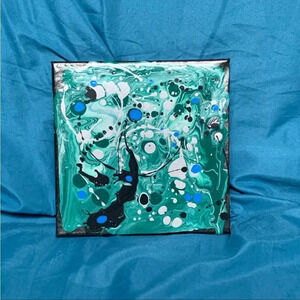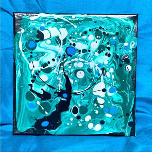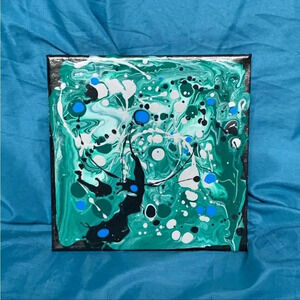 I LOVE this one! 8x8 wrapped canvas with green, blue & white paint pour, plus silver, black and blue accents on a metallic black background. Created with acrylic paints. Original art, painted March 2022.