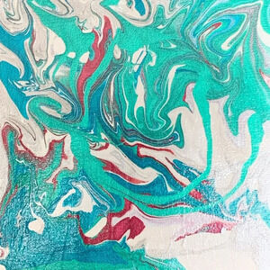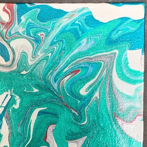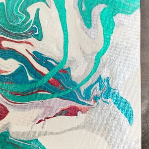 Original paint pour art with metallic teal, aqua, white, silver and wine on an 8”x8” canvas board. Acrylic varnish gloss provides a shimmery top coat to fully set off the color of this piece.