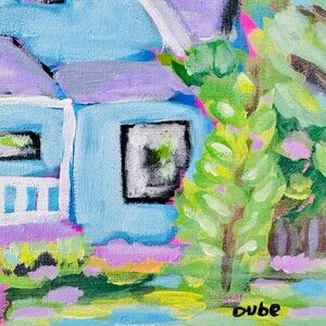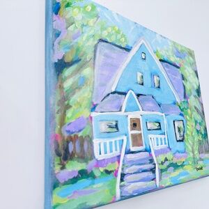 Collectible - beautiful contemporary impressionistic style landscape painting of a blue home with a purple roof. This 11" x 14" original work of art is hand painted with acrylic paint on stretched canvas. For protection, it has been sealed with a satin varnish. The half-inch sides are painted.